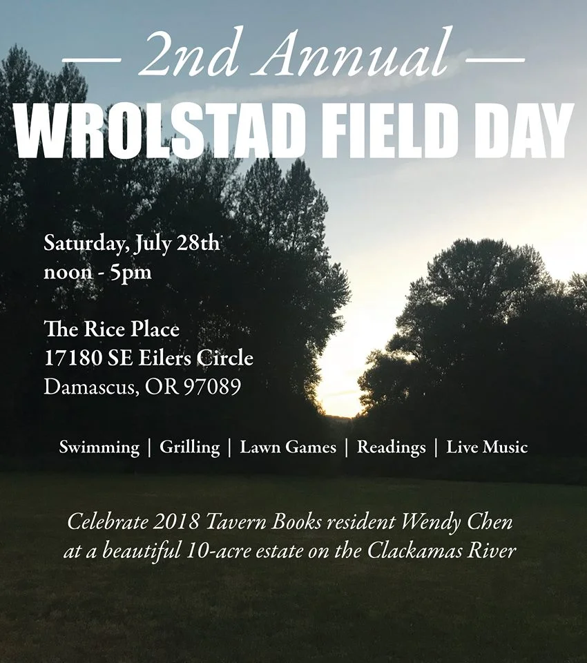 Join Tavern Books for an afternoon of lawn games, river swimming, and poetry in celebration of the 2nd annual Wrolstad Residency! 2018 resident Wendy Chen (Unearthings, 2018) is generously opening up The Rice Place — the site of her month-long Tavern Books residency — to the general public. This will be a great opportunity to meet Wendy, hear a brief program update, listen to live music, and relax on a gorgeous 10-acre estate just outside the city. Thank you to the Friends of Clyde Rice for partnering with us on this exciting program, and to Lagunitas, our beer sponsor.